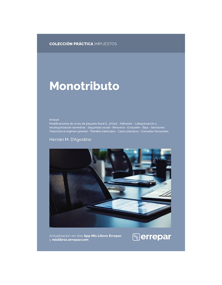 Esta nueva obra incluye también las modificaciones introducidas por la ley de medidas fiscales paliativas y relevantes (ley 27743), así como información de interés sobre el procedimiento permanente de transición al régimen general y sus beneficios, para aquellos monotributistas que efectúen la renuncia o resulten excluidos del RS.